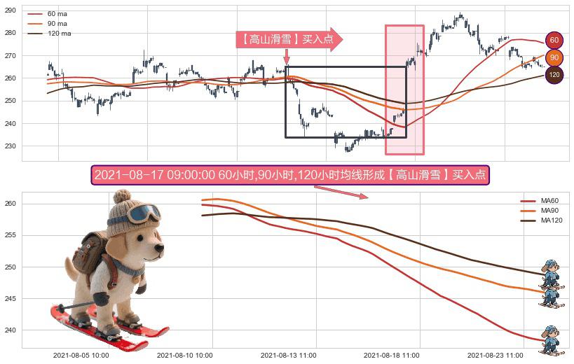 形态多维评估: ⚀ 2021-08-09 15:00:00小时-2021-08-23 15:00:00小时显现 60小时-90小时-120小时均线 【高山滑雪】买入点 看多信号,后市看涨,买入