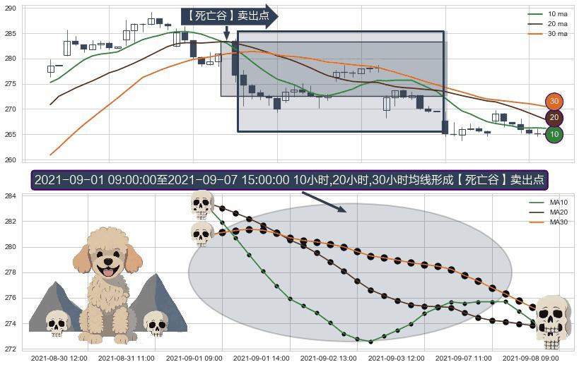 形态多维评估: ⚀ 2021-09-01 10:00:00-小时至2021-09-07 15:00:00-小时显现 10小时-20小时-30小时均线 【死亡谷】卖出点 看空信号,后市看跌,卖出