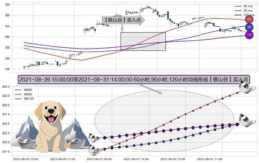 形态多维评估: ⚀ 2021-08-27 09:00:00-小时至2021-08-31 14:00:00-小时显现 60小时-90小时-120小时均线 【银山谷】买入点 看多信号,后市看涨,买入