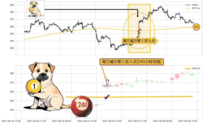形态多维评估: ⚀ 2021-08-24 09:00:00-小时显现 葛兰威尔均线 240小时均线 第买①入点 走势反转见底信号,后市看涨,买进信号