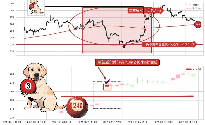 形态多维评估: ⚀ 2021-08-24 09:00:00-小时显现 葛兰威尔均线 240小时均线 第③买入点 上升趋势的中继信号,后市看涨,买进信号