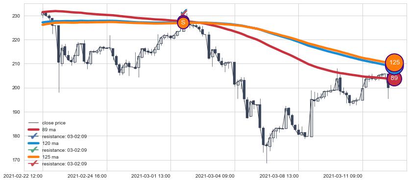下跌趋势02-22 12:00-03-12 09:00,均线120, 89, 125确认关键阻力1处