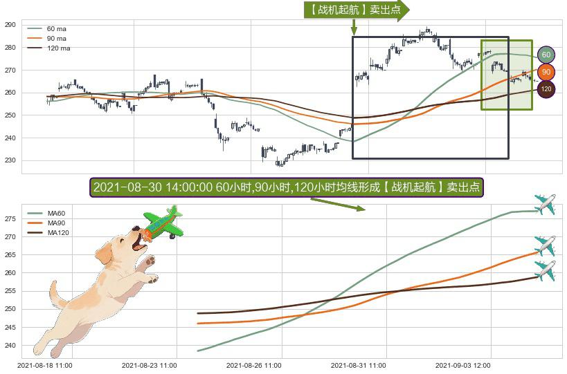 形态多维评估: ⚀ 2021-08-23 15:00:00小时-2021-09-07 15:00:00小时显现 60小时-90小时-120小时均线 【战机起航】卖出点 看空信号,后市看跌,卖出