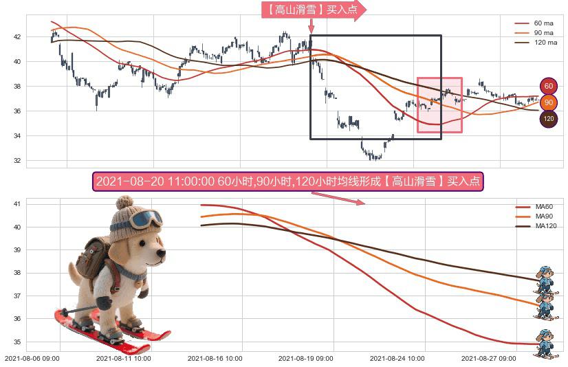 形态多维评估: ⚀ 2021-08-12 14:00:00小时-2021-08-27 14:00:00小时显现 60小时-90小时-120小时均线 【高山滑雪】买入点 看多信号,后市看涨,买入