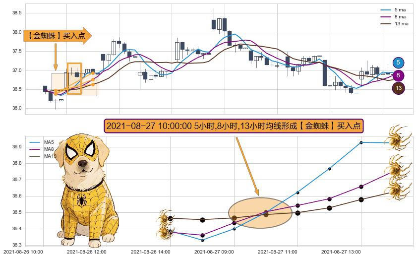 形态多维评估: ⚀ 2021-08-27 10:00:00小时显现 5小时-8小时-13小时均线 【金蜘蛛】买入点 看多信号,后市看涨,买入