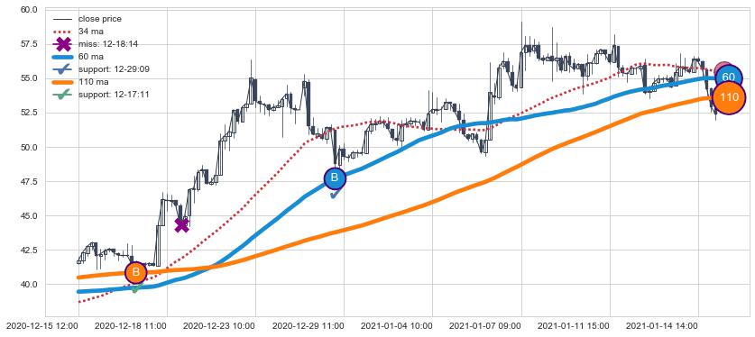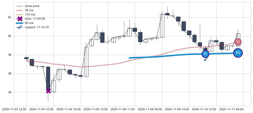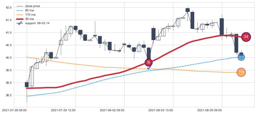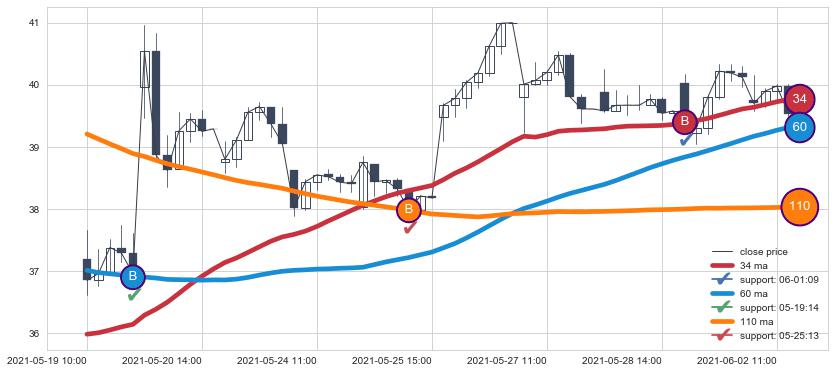 上涨趋势05-19 10:00-06-02 12:00,均线34, 60, 110确认关键支撑3处