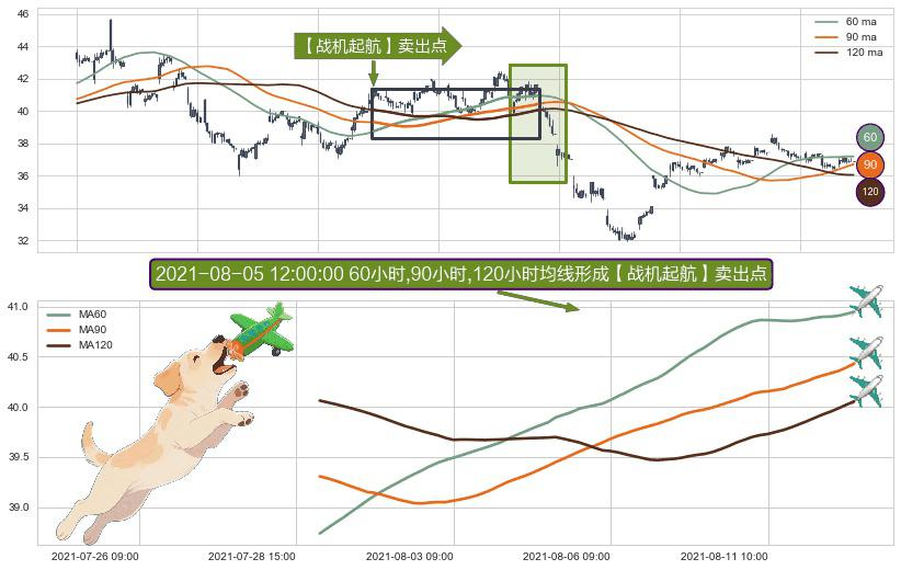 形态多维评估: ⚀ 2021-07-29 11:00:00小时-2021-08-12 14:00:00小时显现 60小时-90小时-120小时均线 【战机起航】卖出点 看空信号,后市看跌,卖出