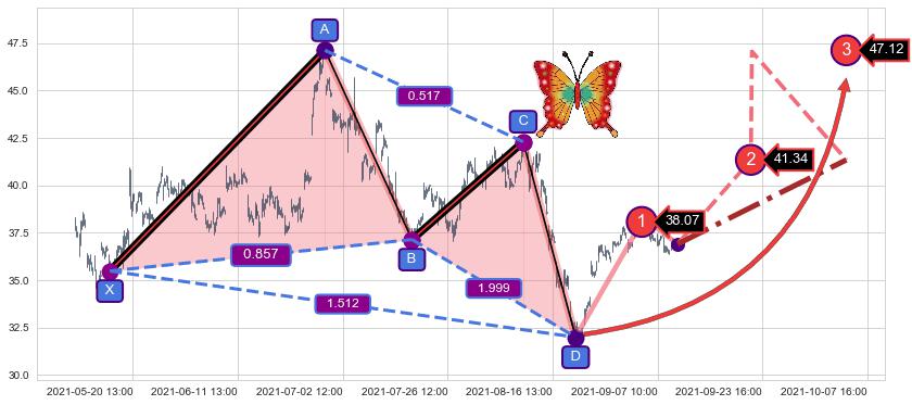 ➣ 已完成【蝴蝶】形态起点X: 05-17:10, 终点D: 08-19:14, 共445交易小时