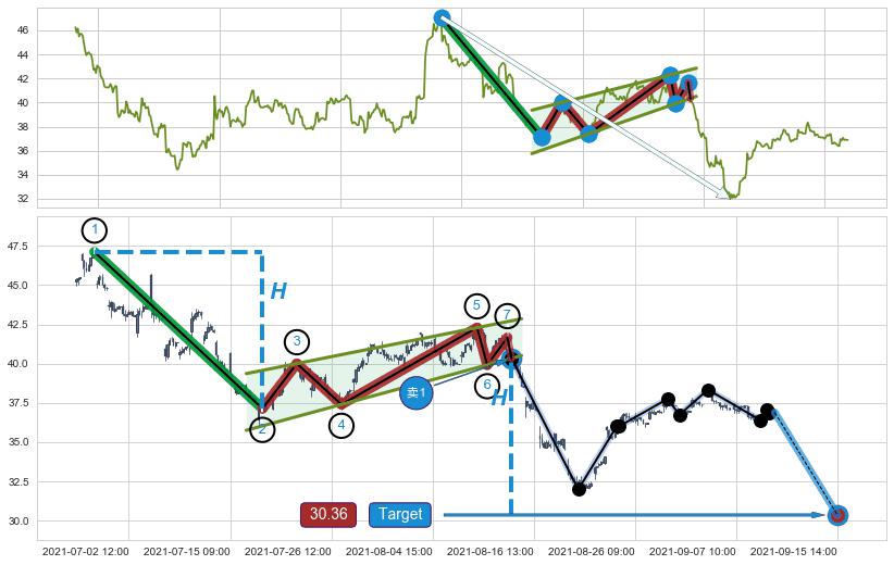 ➣ 最小中继整理跌幅→𝐇: 9.98 (𝐇旗杆的长度:旗杆起点→顶点)