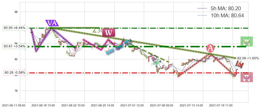 ➣ 预测:2021-08-06 12:00,【试探阻力】稳定目前下跌趋势的前提下,预测价格:79.75