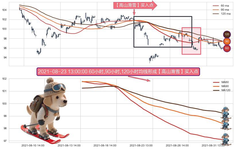 形态多维评估: ⚀ 2021-08-13 15:00:00小时-2021-08-31 12:00:00小时显现 60小时-90小时-120小时均线 【高山滑雪】买入点 看多信号,后市看涨,买入