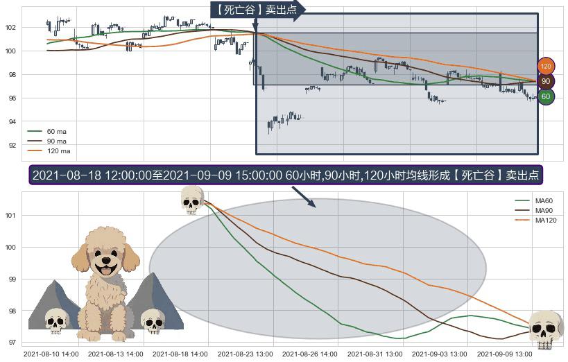 形态多维评估: ⚀ 2021-08-18 13:00:00-小时至2021-09-09 15:00:00-小时显现 60小时-90小时-120小时均线 【死亡谷】卖出点 看空信号,后市看跌,卖出