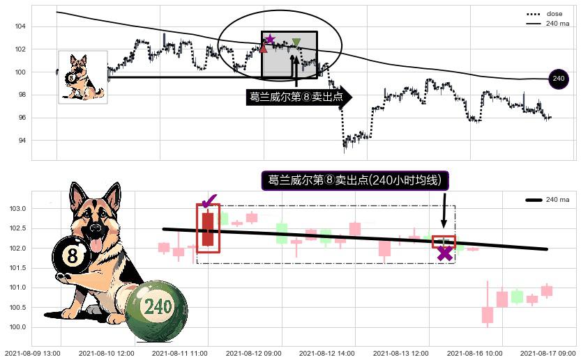形态多维评估: ⚀ 2021-08-13 13:00:00-小时显现 葛兰威尔均线 240小时均线 第⑧卖出点 下降趋势的中继信号,后市看跌,卖出信号