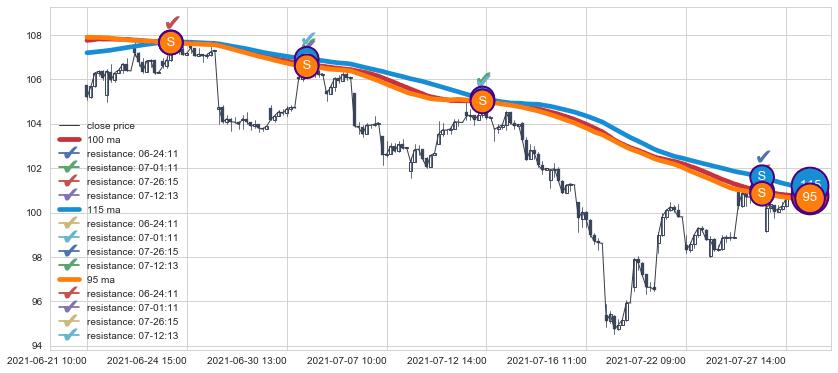 下跌趋势06-21 10:00-07-28 09:00,均线115, 100, 95确认关键阻力4处