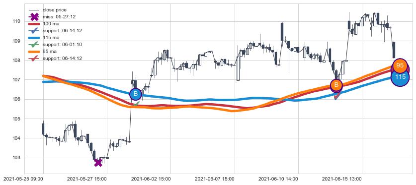 上涨趋势05-25 09:00-06-17 09:00,均线115, 100, 95确认关键支撑2处