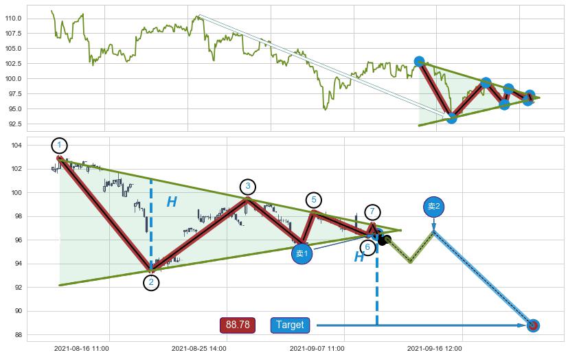 ➣ 【已确认突破】最后价格:96.09与最小【整理】第一目标价格→(09-22:14: 88.78 )相较: 下跌空间【较大】