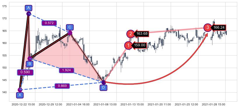 ➣ 未完成【鲨鱼】形态起点X: 01-11:15, 已到达C点: 01-27:11, 预测最终D点: 02-04:14, 共124交易小时