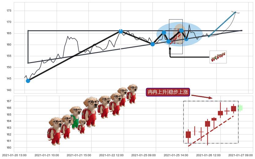 从2021-01-14 09:00至2021-01-15 10:00,共包含9个小时,阶段股价上涨0.80%,阶段股价变动位移路程比: 1 : 5