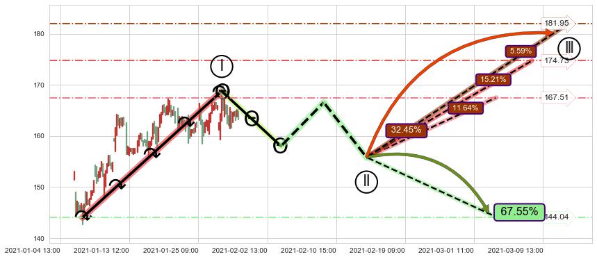 ➣ 循环浪继续向上【平均值】位置(03-08:13, 174.73),匹配聚类样本比例46.87%, 可能性概率15.21%