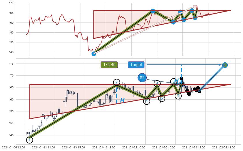 ➢ 【已确认突破】最后价格:163.41与最小【整理】第一目标价格→(02-02:09: 174.40 )相较: 上涨空间【较大】