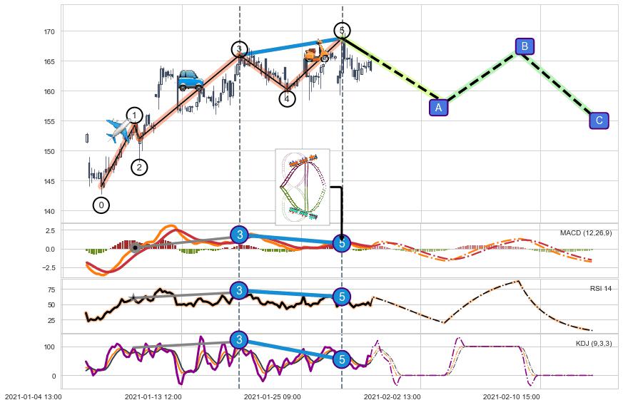 ➣ 1,3,5驱动浪MACD, RSI, KDJ走势都出现【常规背离】反转信号增强