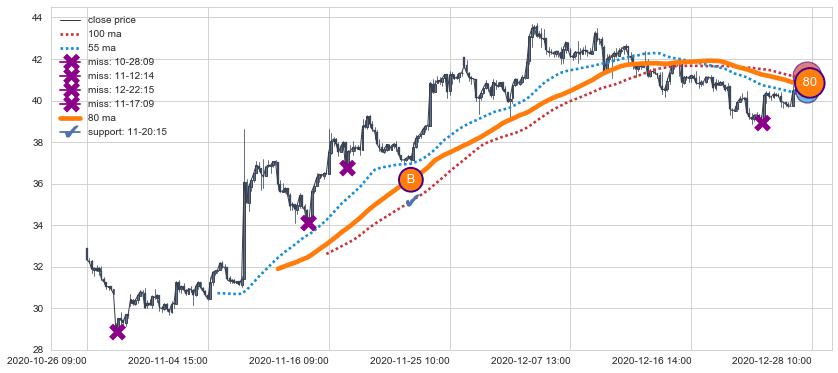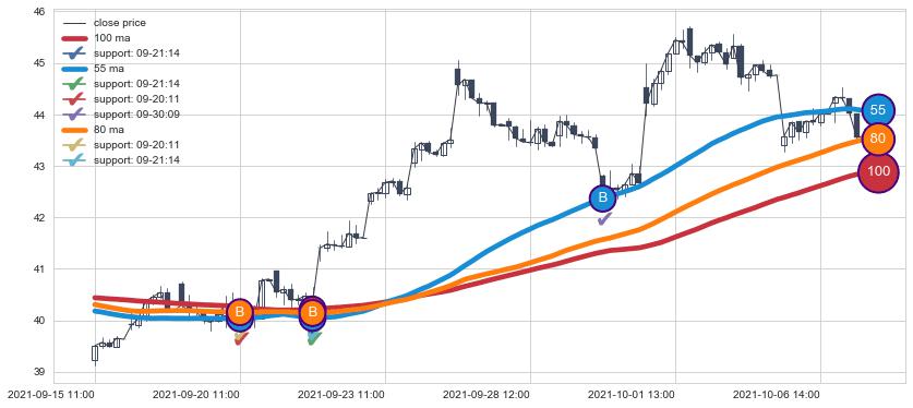 上涨趋势09-15 11:00-10-07 13:00,均线80, 100, 55确认关键支撑3处