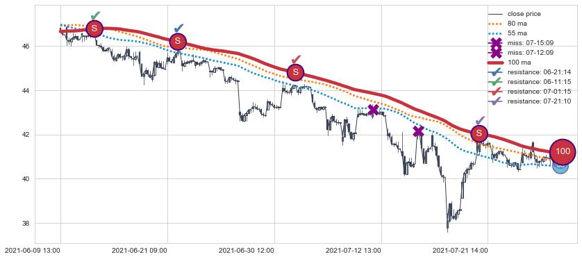 下跌趋势06-09 13:00-07-28 10:00,均线100确认关键阻力4处