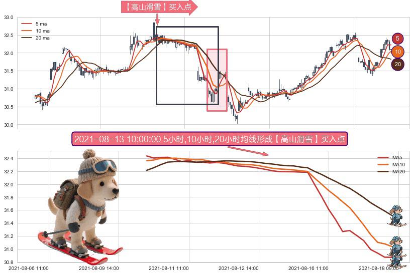 ⚀ 2021-08-10 11:00:00小时-2021-08-17 14:00:00小时显现 5小时-10小时-20小时均线 【高山滑雪】买入点 看多信号,后市看涨,买入