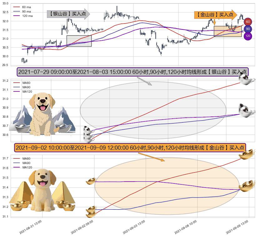 ⚃ 2021-09-02 11:00:00-小时至2021-09-09 12:00:00-小时显现 60小时-90小时-120小时均线 【金山谷】买入点 其再次确认了买入信号,可靠性更强,买入