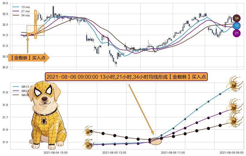 ⚀ 2021-08-06 09:00:00小时显现 13小时-21小时-34小时均线 【金蜘蛛】买入点 看多信号,后市看涨,买入