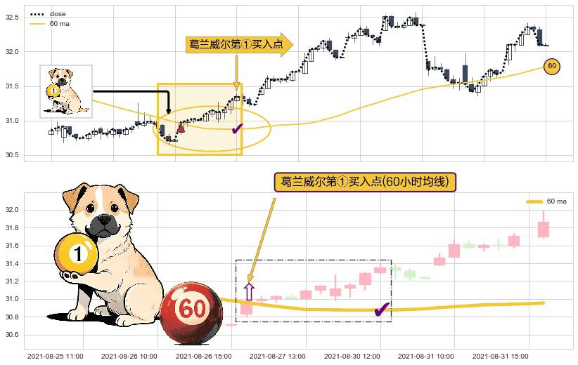 ⚀ 2021-08-27 09:00:00-小时显现 葛兰威尔均线 60小时均线 第买①入点 走势反转见底信号,后市看涨,买进信号