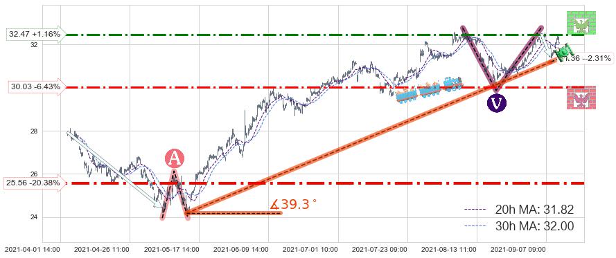🍖 长线趋势跟踪组合短线均值回复[强支撑信号]2021-05-13 10:00-2021-09-08 09:00上升趋势依然成立(上涨趋势跟踪依然可行),短线价格略微下行回调(均值回复猜想),即将接近趋势提供的未破位的支撑价格:31.36。