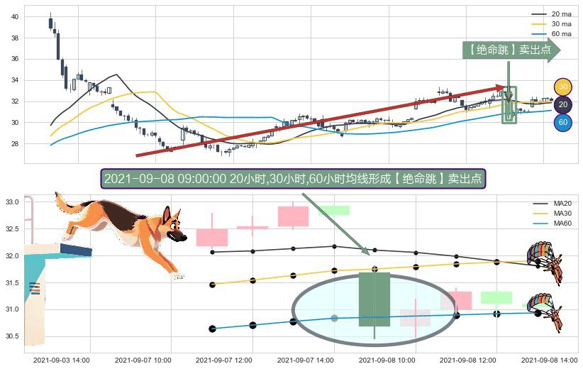 形态多维评估: ⚀ 2021-09-08 09:00:00小时显现 20小时-30小时-60小时均线 【绝命跳】卖出点 看空信号,后市看跌,卖出