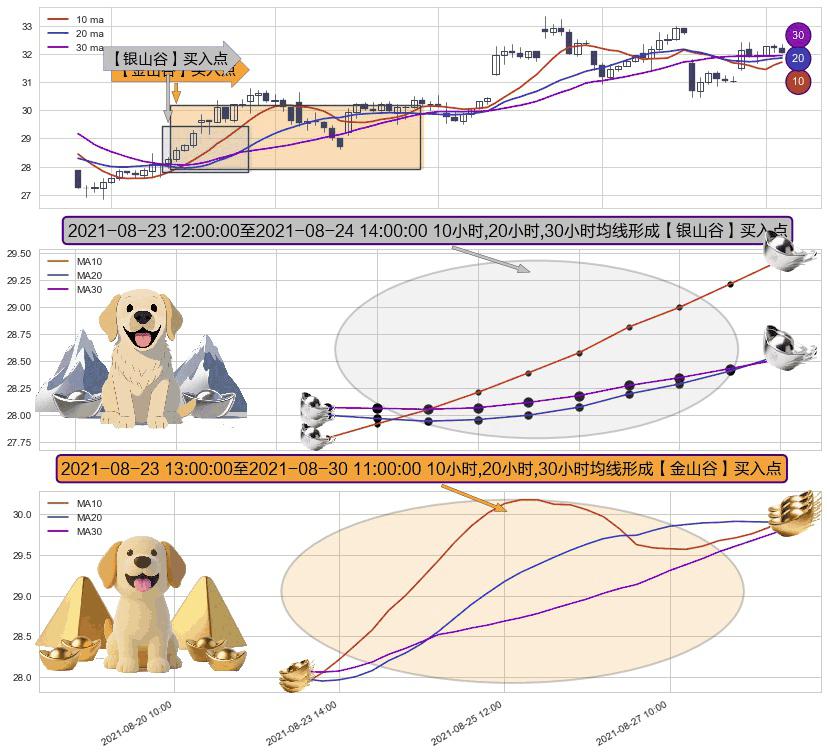 形态多维评估: ⚀ 2021-08-23 14:00:00-小时至2021-08-30 11:00:00-小时显现 10小时-20小时-30小时均线 【金山谷】买入点 其再次确认了买入信号,可靠性更强,买入