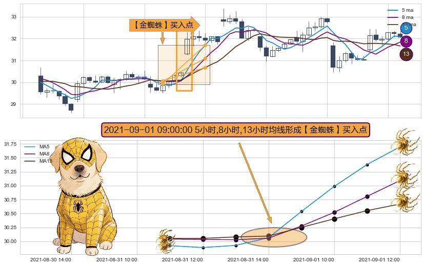 形态多维评估: ⚀ 2021-09-01 09:00:00小时显现 5小时-8小时-13小时均线 【金蜘蛛】买入点 看多信号,后市看涨,买入
