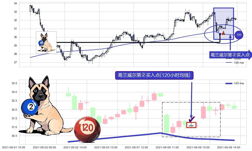 形态多维评估: ⚀ 2021-09-08 13:00:00-小时显现 葛兰威尔均线 120小时均线 第②买入点 上升趋势的中继信号,后市看涨,买进信号