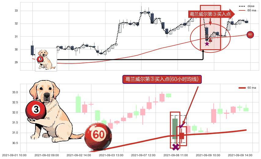 形态多维评估: ⚀ 2021-09-08 10:00:00-小时显现 葛兰威尔均线 60小时均线 第③买入点 上升趋势的中继信号,后市看涨,买进信号