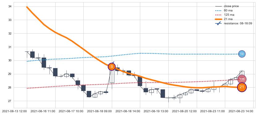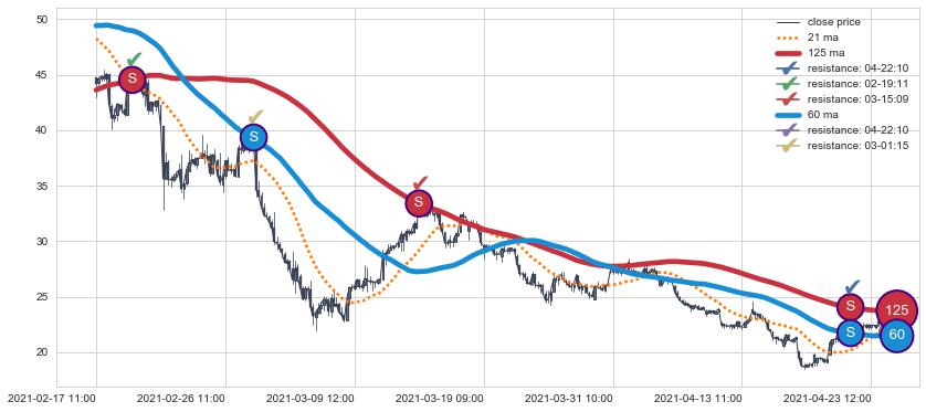 下跌趋势02-17 11:00-04-26 09:00,均线60, 125确认关键阻力4处