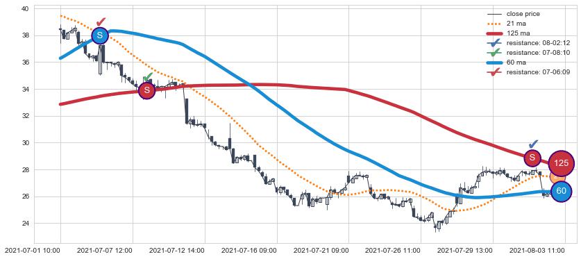 下跌趋势07-01 10:00-08-03 11:00,均线60, 125确认关键阻力3处