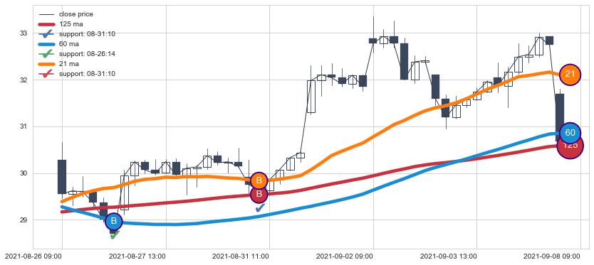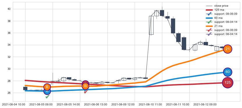 上涨趋势08-04 10:00-08-12 11:00,均线21, 60, 125确认关键支撑2处