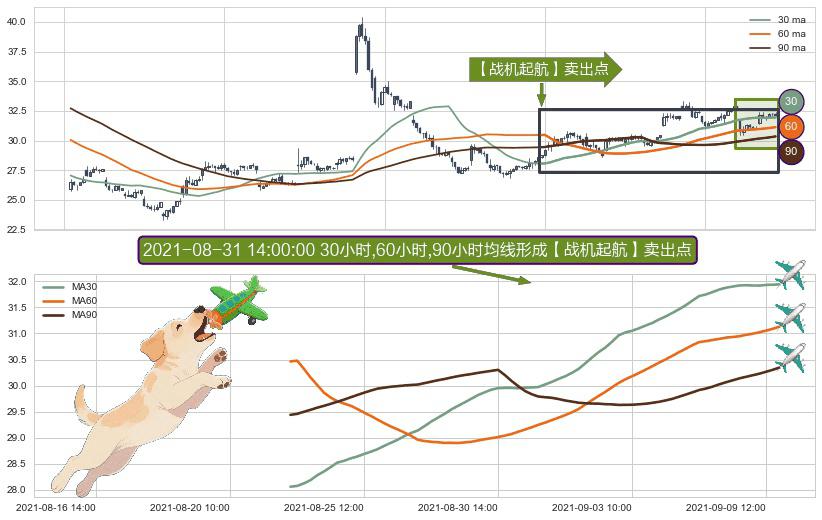 形态多维评估: ⚀ 2021-08-23 13:00:00小时-2021-09-09 14:00:00小时显现 30小时-60小时-90小时均线 【战机起航】卖出点 看空信号,后市看跌,卖出