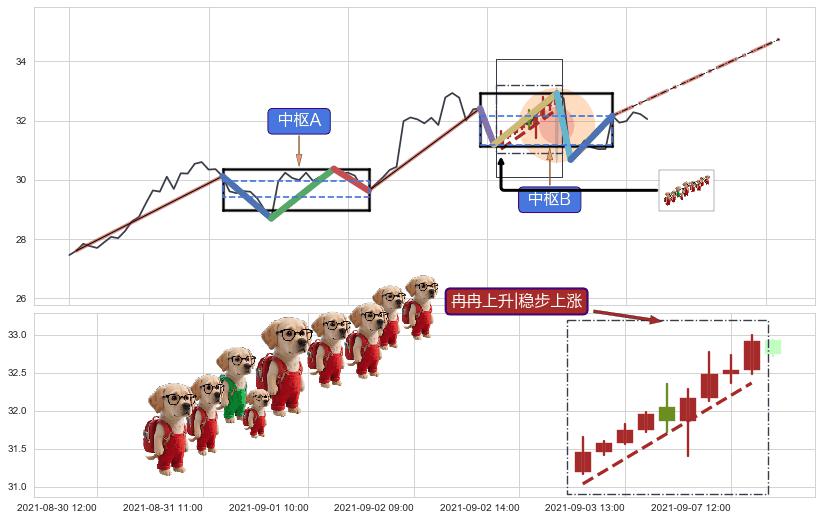 ➣ 【中枢B】:09-02:14-09-09:09,中枢由5笔构成,共20交易小时, ZG=32.16, ZD=31.19