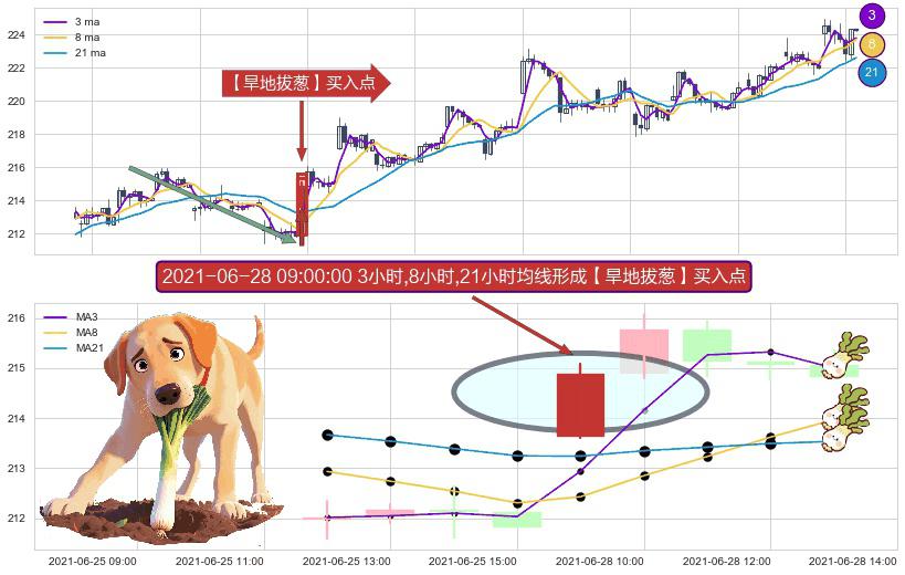 ⚀ 2021-06-28 09:00:00小时显现 3小时-8小时-21小时均线 【旱地拔葱】买入点 看多信号,后市看涨,买入