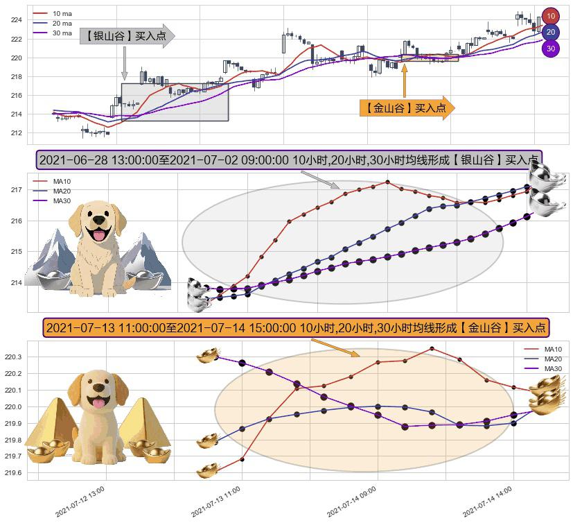 ⚀ 2021-07-13 12:00:00-小时至2021-07-14 15:00:00-小时显现 10小时-20小时-30小时均线 【金山谷】买入点 其再次确认了买入信号,可靠性更强,买入