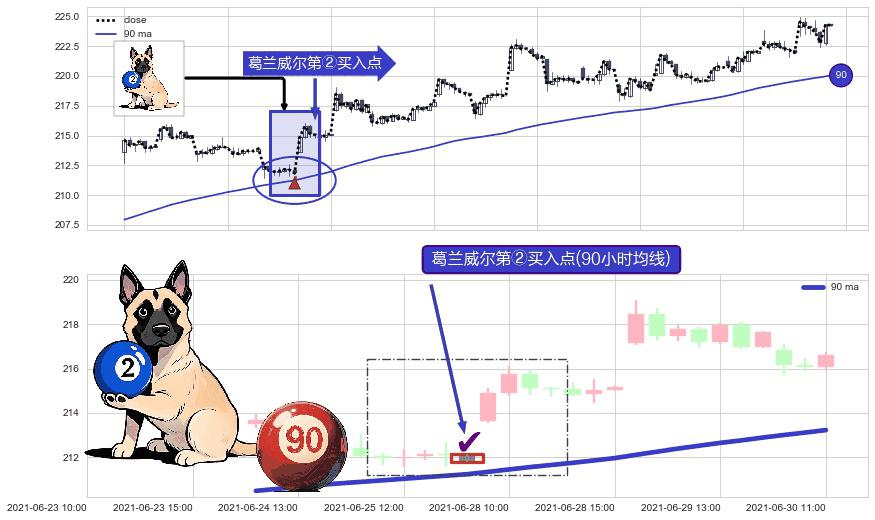 ⚀ 2021-06-25 15:00:00-小时显现 葛兰威尔均线 90小时均线 第②买入点 上升趋势的中继信号,后市看涨,买进信号