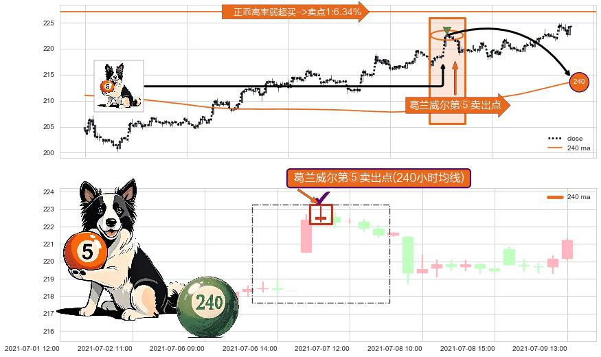 ⚀ 2021-07-07 10:00:00-小时显现 葛兰威尔均线 240小时均线 第⑤卖出点 上升趋势均值回复的短线回落信号,后市看跌,卖出信号