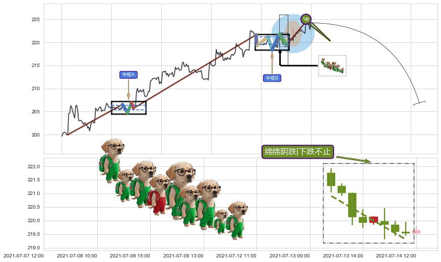 ➣ 【中枢B】:07-07:15-07-14:11,中枢由6笔构成,共32交易小时, ZG=221.23, ZD=219.54