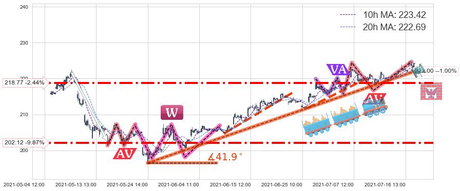 🍖 长线趋势跟踪组合短线均值回复[强支撑信号]2021-05-24 14:00-2021-07-19 15:00上升趋势依然成立(上涨趋势跟踪依然可行),短线价格略微下行回调(均值回复猜想),即将接近趋势提供的未破位的支撑价格:222.00。