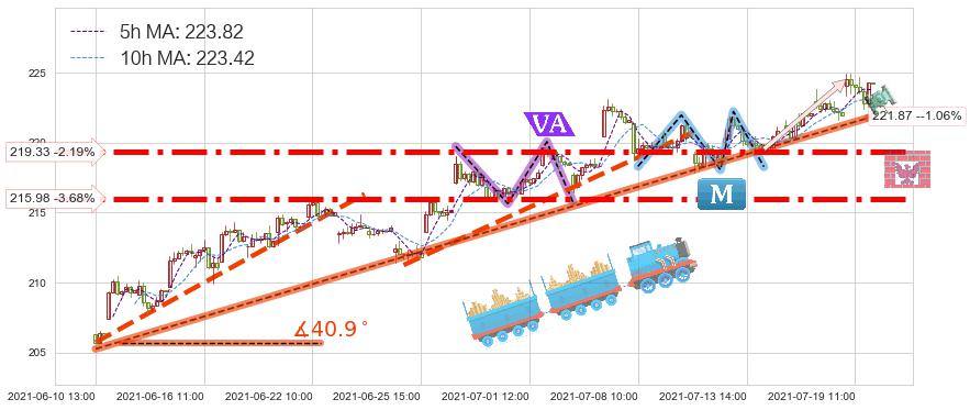 ♘ 在最后的上升阶段2021-06-10 13:00至2021-07-19 14:00存在 持续未破位的支撑位 ,支撑价格221.87,支撑可信任强度88.60%,其距离最后价格224.24相差 -1.06%
