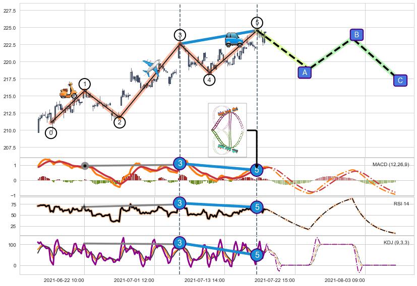 ➢ 1,3,5驱动浪MACD, RSI, KDJ走势都出现【常规背离】反转信号增强